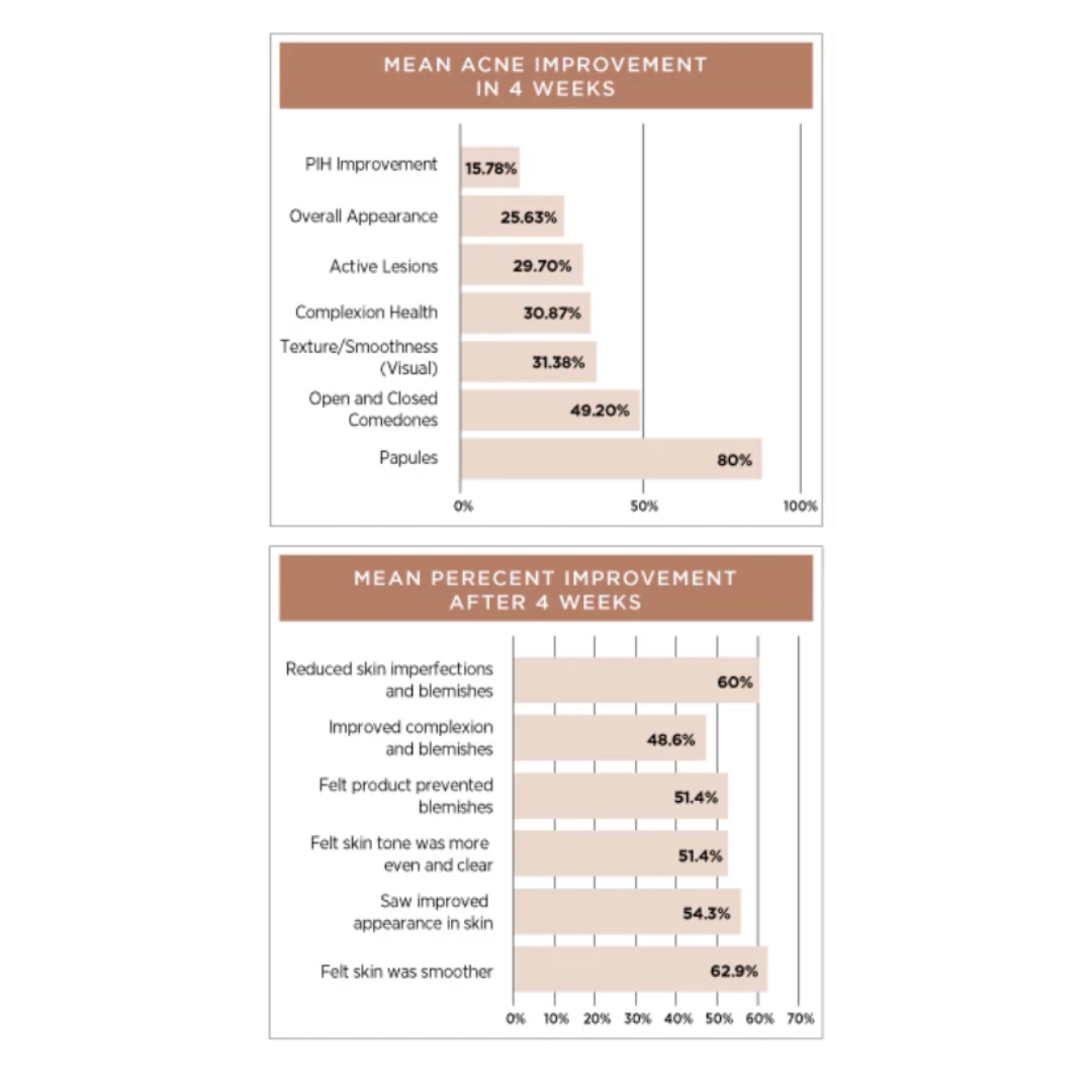 The proprietary formula that makes up Skin Perfection Elixir improved acne on 60% of participants in 4 weeks using nothing topically on the face. This formulation targets the source of acne for powerful results.