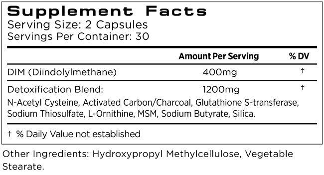 DIM (diinodolylmethane), N-acetyl cysteine, activated carbon/charcoal, glutathione s transferase, sodium thiosulfate, L-omithin, MSM, sodium butyrate, silica, hydroxypropyl methylcellulose, vegetable stearate.