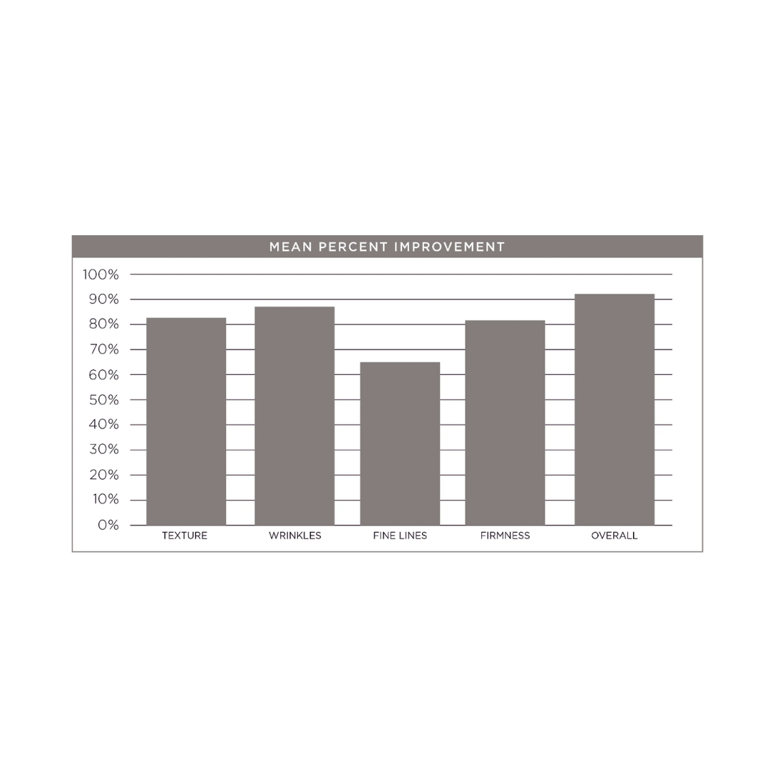 - 91% of participants had an overall improvement in texture, wrinkles, fine lines and firmness.
